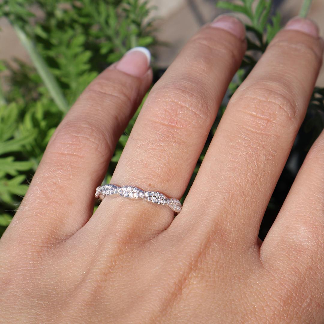 If sparkle is what you’re after, The Eternity delivers in every way. This full eternity band showcases a beautifully intricate twisting gemstone design that makes any ring stack come alive. Crafted from solid 925 sterling silver, it combines lasting shine with elegant sophistication. Wear The Eternity solo or pair it with your engagement ring for a stunning set—our top picks? It looks absolutely breathtaking with The Helena or The Delilah.